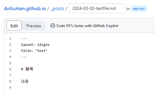 저장소로 돌아가 Add file -> create new file을 클릭하여 _posts 디렉토리 아래에 연-월-일-`이름`.md로 파일을 생성하고